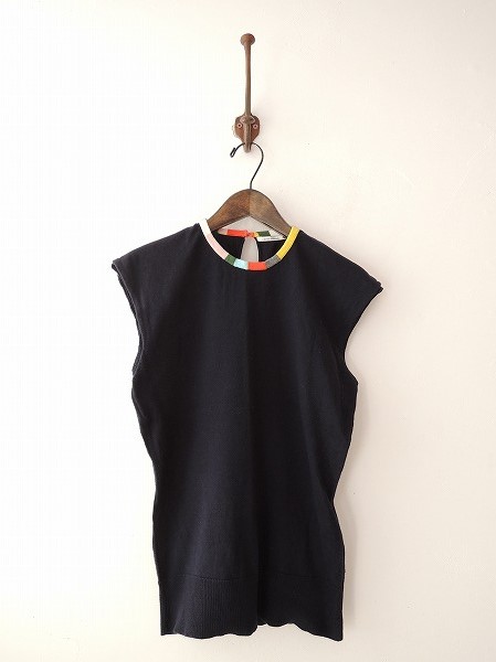 デザイン:mina perhonen 「fantastic!」のフレンチスリーブニットカットソーです。ベースカラーはネイビーで薄手ニット地であしらわれており、襟元はカラフルなニットのパイピングが施されております。バック襟元にループボタン付きのドロップホールが施されております。(掲載写真は、実商品のカラーにできるだけ近づけるよう努力はしておりますが、お使いのモニターや画面設定等によっては、色が異なって見える場合もございますので、予めご了承下さい)