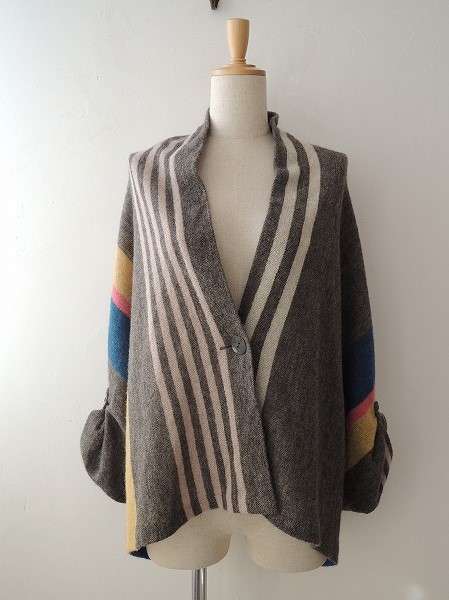 デザイン:mina perhonen 「float」のマルチボーダーニットカーディガンです。カラーはグレーベースにピンク系・マスタード・ブルー・オフホワイトのマルチボーダー編みの柔らかな手触りの薄手ニットであしらわれております。フロントひとつボタン開閉で、袖はロールアップができるデザインです。定価31,500円の商品です。(掲載写真は、実商品のカラーにできるだけ近づけるよう努力はしておりますが、お使いのモニターや画面設定等によっては、色が異なって見える場合もございますので、予めご了承下さい)