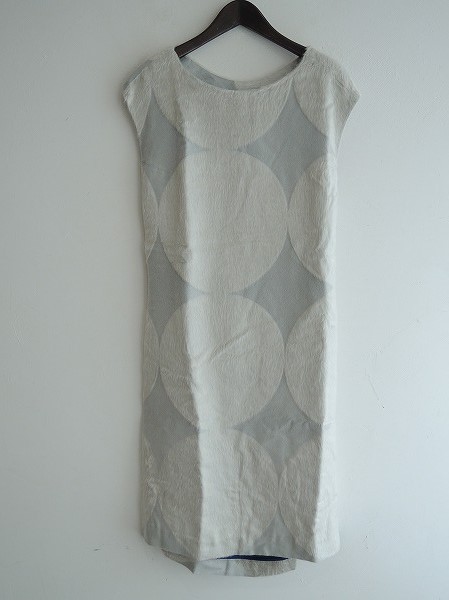 デザイン:mina perhonen「cat circle」のノースリワンピースです。カラーはライトグレー地にやや光沢のあるオフホワイトの毛足の長めの生地があしらわれています。左脇ファスナーで着脱でき、両腰にひもが付いており、裾両サイドに8cmのスリット入りです。裏地付き。(掲載写真は、実商品のカラーにできるだけ近づけるよう努力はしておりますが、お使いのモニターや画面設定等によっては、色が異なって見える場合もございますので、予めご了承下さい)