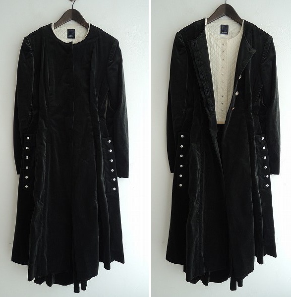 デザイン:mina perhonen 「moss」のコートワンピースです。深緑のベルベット地で、フロント上部のボタン開閉、バック襟元にスリット入りです。内側のトップはアイボリーのキルト地の別布が施されており、スカート部は両腰ボタン留めのフロントのみ付いたデザインで取り外し可能です。定価81,900円です。(掲載写真は、実商品のカラーにできるだけ近づけるよう努力はしておりますが、お使いのモニターや画面設定等によっては、色が異なって見える場合もございますので、予めご了承下さい)