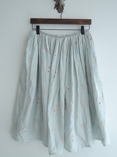 デザイン:mina perhonen 「pop corn」の刺繍スカートです。カラーはサックスで、薄手の生地であしらわれており、全面に刺繍&カットワーク刺繍が施されております。ウエストは光沢のあるロープに切り替えられ、左サイドのフック&ファスナーで着脱でき、裏地付きです。(掲載写真は、実商品のカラーにできるだけ近づけるよう努力はしておりますが、お使いのモニターや画面設定等によっては、色が異なって見える場合もございますので、予めご了承下さい)