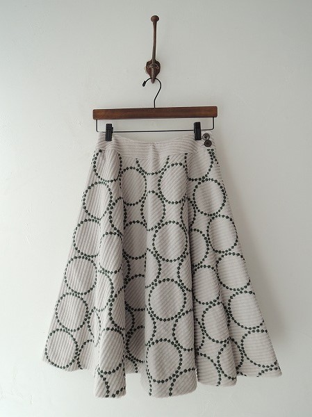 デザイン:mina perhonen「tambourine grande」の刺繍スカートです。カラーはライトグレーの凹凸のある生地に、深いグリーンで刺繍が全面に施され、左腰ボタン&ファスナーで着脱します。裏地付きで、定価は48,000円です。(掲載写真は、実商品のカラーにできるだけ近づけるよう努力はしておりますが、お使いのモニターや画面設定等によっては、色が異なって見える場合もございますので、予めご了承下さい)