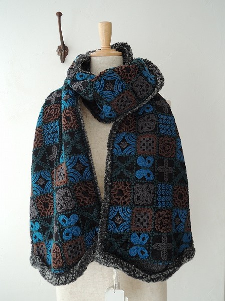 デザイン:mina perhonenのforest tileシリーズの刺繍マフラーです。カラーはグレー系のボアと、ビビットなブルー×ブラウン×グリーンなどの刺繍があしらわれたブラックのチュール地の組み合わせです。素材は表生地がコットン100%、刺繍部分がコットン100%、裏生地がアクリル50%、ウール30%、ベビーアルパカ20%で、定価は35,700円です。