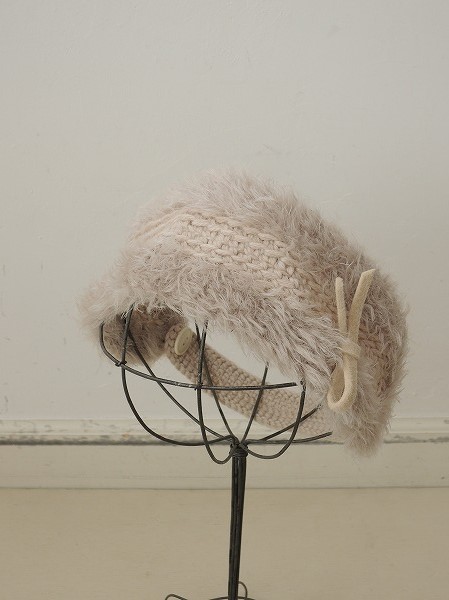 デザイン:mina perhonen×hitomi shinoyamaのヘアアクセです。カラーはライトピンクベージュのニット地に、グレーがかったライトピンクベージュの毛足の長い素材のニット地の組み合わせで、柔らか なブラウンのフェルトリボンがあしらわれたデザインで、留め部分はボタンです。