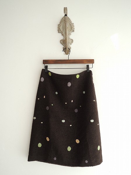 デザイン:mina perhonen 「luster」のドット台形スカートです。カラーはダークブラウン地にパープル・黄緑・ライトピンクなど、パイル素材で、ウエスト左サイドのジッパーで着脱できます。ポケットはなく、裏地付きで、定価は37,800円です。 (掲載写真は、実商品のカラーにできるだけ近づけるよう努力はしておりますが、お使いのモニターや画面設定等によっては、色が異なって見える場合もございますので、予めご了承下さい)