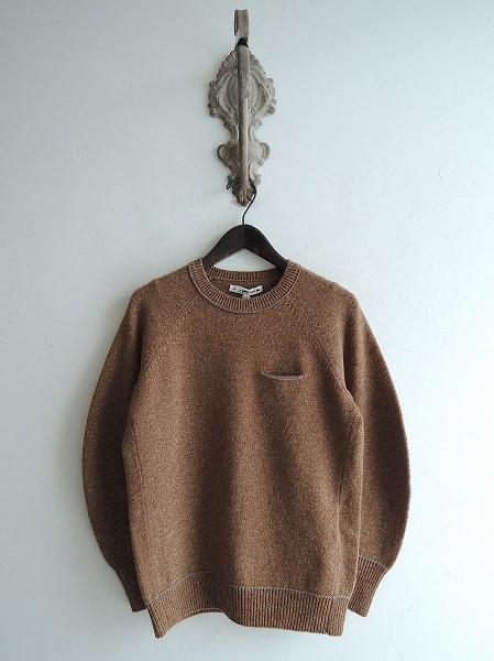 デザイン:mina perhonen 「brown sugar」のニットセーターです。カラーはブラウンミックスで、衿ぐり・袖口・裾・ポケットにグレーのラインが施されています。左胸ポケット付きで、定価37,800円です。(掲載写真は、実商品のカラーにできるだけ近づけるよう努力はしておりますが、お使いのモニターや画面設定等によっては、色が異なって見える場合もございますので、予めご了承下さい)