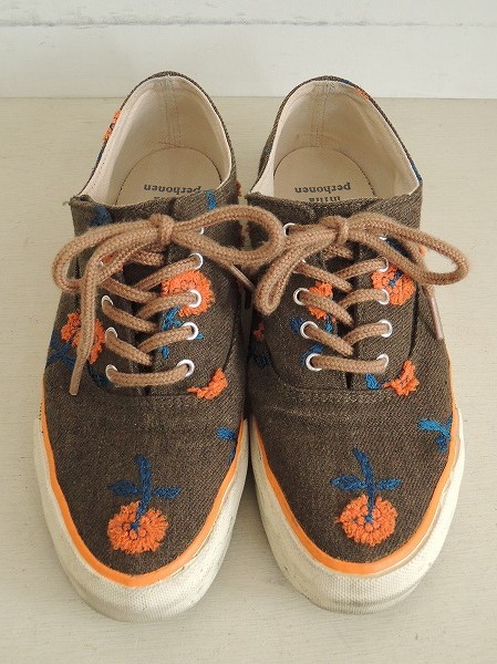 デザイン:mina perhonenのskipシリーズのお花刺繍スニーカーです。カラーはグリーがかったブラウンで、オレンジ×ネイビーのお花刺繍モチーフ飾られたデザインです。甲には薄ブラウンのシューレースがあしらわれています。