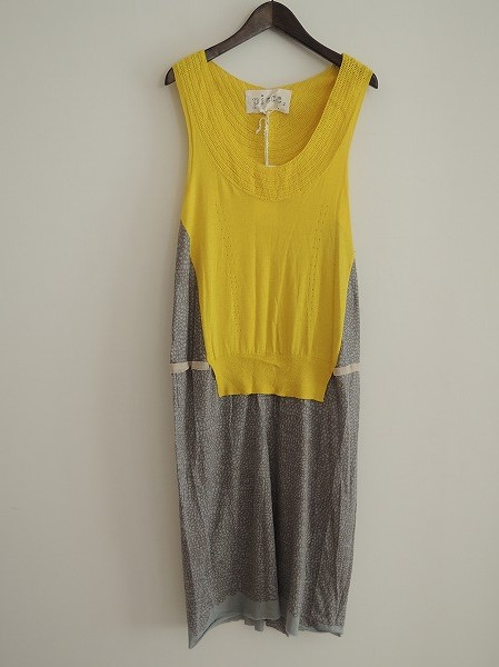 デザイン:mina perhonen 「paula」のノースリワンピースです。カラーはイエロー×グレー系の薄手ニット地であしらわれており、定価は39,900円です。(掲載写真は、実商品のカラーにできるだけ近づけるよう努力はしておりますが、お使いのモニターや画面設定等によっては、色が異なって見える場合もございますので、予めご了承下さい)