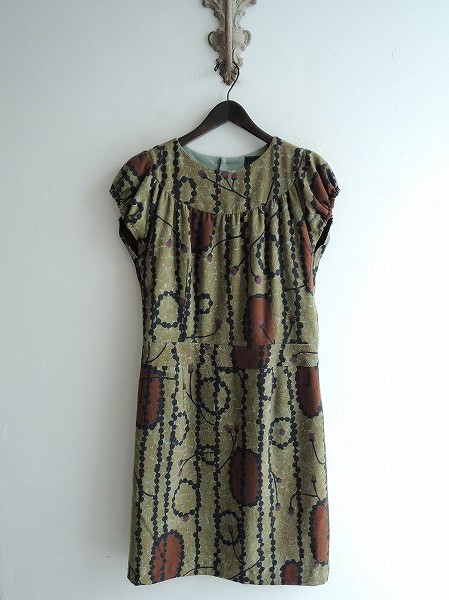 デザイン:mina perhonen 「garland」のワンピースです。カラーはカーキ・茶・黒などの総柄プリントで、やや毛羽感のある素材であしらわれております。バックネックに2つボタンが付いており、左脇下ジッパー付きです。フレンチ袖の上部はゴムが施され、裏地付きです。(掲載写真は、実商品のカラーにできるだけ近づけるよう努力はしておりますが、お使いのモニターや画面設定等によっては、色が異なって見える場合もございますので、予めご了承下さい)