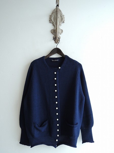 デザイン:mina perhonen「 shore」のニットカーディガンです。カラーはネイビーで、ニット素材であしらわれております。ボタン開閉で、両サイドにポケットがございます。定価50,400円です。 (掲載写真は、実商品のカラーにできるだけ近づけるよう努力はしておりますが、お使いのモニターや画面設定等によっては、色が異なって見える場合もございますので、予めご了承下さい)