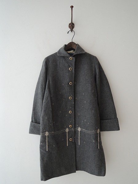 デザイン:mina 「yuki no hi」のコートです。カラーはグレーで、毛羽のある素材です。フロントボタン開閉で、両腰サイドにシームポケット、左胸裏側に内ポケットがございます。襟&前後身頃に刺繍があしらわれ、袖口は折り返しデザインになっております。アイボリー×ブルーのボーダー柄の裏地が付いております。 (掲載写真は、実商品のカラーにできるだけ近づけるよう努力はしておりますが、お使いのモニターや画面設定等によっては、色が異なって見える場合もございますので、予めご了承下さい)