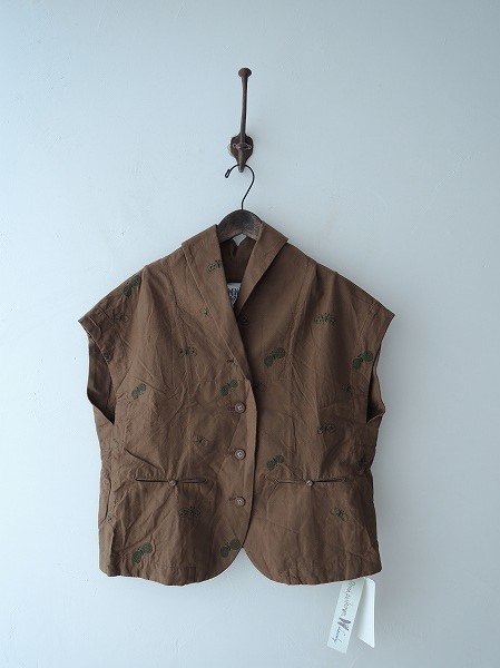 デザイン:ミナペルホネンランドリー 「choucho」のジャケットです。カラーはブラウンでやや薄手生地であしらわれており、グリーンで様々なちょうちょの刺繍が施されております。フロントボタン開閉で、両裾にポケットが付いており、裏地は付いておりません。定価29400円の商品です。(掲載写真は、実商品のカラーにできるだけ近づけるよう努力はしておりますが、お使いのモニターや画面設定等によっては、色が異なって見える場合もございますので、予めご了承下さい)