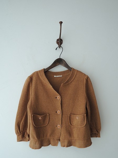 デザイン:mina perhonen 「nostalgia」の七分袖ニットジャケットです。カラーはライトブラウンで、薄手ニット地であしらわれております。両裾にパッチポケット付きで、裏地は付いておりません。(掲載写真は、実商品のカラーにできるだけ近づけるよう努力はしておりますが、お使いのモニターや画面設定等によっては、色が異なって見える場合もございますので、予めご了承下さい)