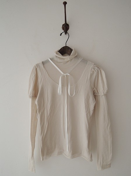 デザイン:mina perhonen 「bonjour」のハイネックカットソーです。カラーはアイボリーで、透け感のある薄手ニット地であしらわれております。切りっぱな し地のレイヤード風のデザインで、半袖の袖口のみゴム入り、衿後に光沢のあるリボンが縫い付けられております。 (掲載写真は、実商品のカラーにできるだけ近づけるよう努力はしておりますが、お使いのモニターや画面設定等によっては、色が異なって見える場合もございますので、予めご了承下さい)