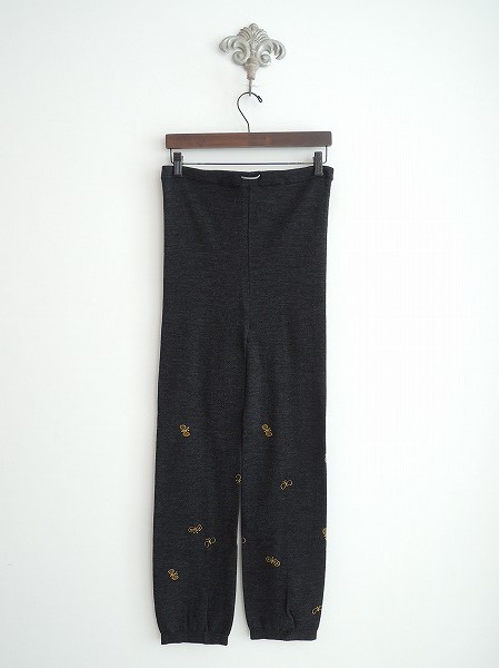 デザイン:mina perhonenのchouchoシリーズの蝶々刺繍スパッツです。カラーはダークグレーのミックスカラーで、足部分にくすんだマスタードで蝶々の刺繍が施されたデザインです。ウエスト部分にライトグレーのゴムが通っています。