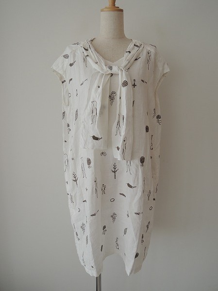 デザイン:mina perhonen「wander」の刺繍ワンピースです。カラーは白地にグレーカーキ系の刺繍入りで、やや透け感のある薄手生地であしらわれております。プルオーバータイプで、ボウタイ付きで、両腰シームポケットがございます。裏地はなく、定価65、100円です。(掲載写真は、実商品のカラーにできるだけ近づけるよう努力はしておりますが、お使いのモニターや画面設定等によっては、色が異なって見える場合もございますので、予めご了承下さい)