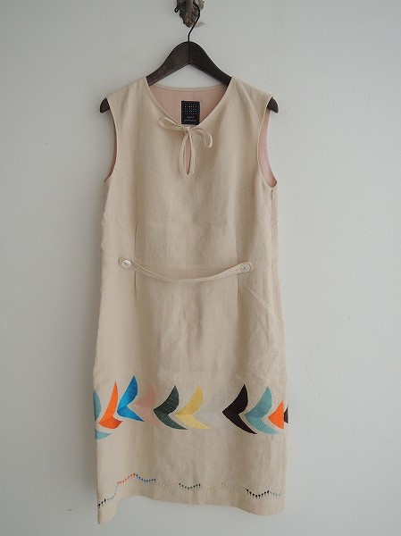 デザイン:mina perhonen 「bird」の刺繍ノースリーブワンピースです。カラーはライトベージュで薄手生地であしらわれており、ライトブルー系・オレンジ・ブラウン・ライトピンクなどのカラフルな刺繍が施されております。フロント襟元は共布ひも付きのスリット入りで、フロントウエスト部に共布ベルトが施されております。左脇下のファスナーで着脱でき、定価45150円の商品です。(掲載写真は、実商品のカラーにできるだけ近づけるよう努力はしておりますが、お使いのモニターや画面設定等によっては、色が異なって見える場合もございますので、予めご了承下さい)