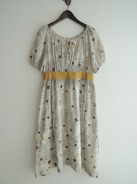 デザイン:mina perhonen 「papillon」シフォンワンピースです。カラーはオフホワイト×グレーベースにブラウン・イエローのプリント入りのシフォン地であしらわれております。フロント襟元はひも付きのスリット入りで、ウエスト部は光沢のあるベージュのテープが施されております。スカート部のみ裏地付きで、左脇下のファスナーで着脱できます。(掲載写真は、実商品のカラーにできるだけ近づけるよう努力はしておりますが、お使いのモニターや画面設定等によっては、色が異なって見える場合もございますので、予めご了承下さい)