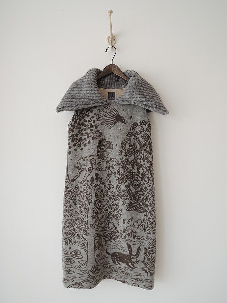 デザイン:mina perhonen 「imagine」のワンピースです。カラーはミックスグレーベースにこげ茶で、動物などのプリントがあしらわれた毛羽のある生地に、ネック部分にはグレーのリブ使いのニットが施されています。左脇下のファスナーで着脱し、裏地付きです。(掲載写真は、実商品のカラーにできるだけ近づけるよう努力はしておりますが、お使いのモニターや画面設定等によっては、色が異なって見える場合もございますので、予めご了承下さい)