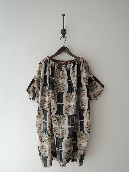 デザイン:mina perhonen 「merci」のドルマンワンピースです。ライトベージュベースにネイビー系・濃モスグリーン・モカベージュ・ブラウン系などの総柄プリントの薄手生地であしらわれております。襟元はひも入りで、裏地は付いておりません。(掲載写真は、実商品のカラーにできるだけ近づけるよう努力はしておりますが、お使いのモニターや画面設定等によっては、色が異なって見える場合もございますので、予めご了承下さい)