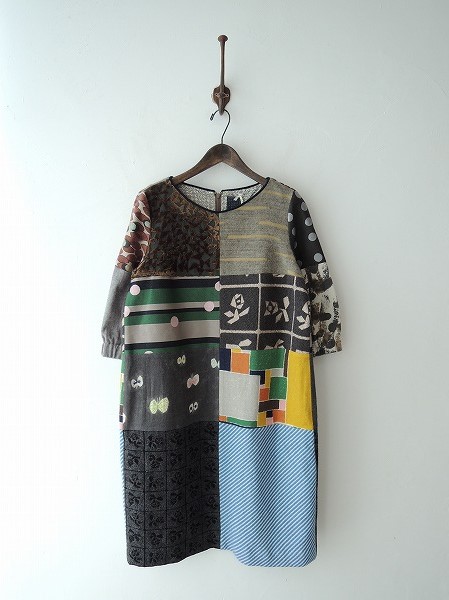 デザイン:mina perhonen 「memory」の七分袖ワンピースです。濃紺・緑・グレー・ピンクの「festival」、ムラのある濃グレーベースの「hana hane」、薄青×白の「sweets」など、様々なテキスタイル柄が切替えられた贅沢なデザインになっております。背上部のフック&ファスナーで着脱でき、袖口はゴム入りになっております。裏地はオフホワイトベースの「sleeping rose」のテキスタイル柄です。定価78750円の商品です。(掲載写真は、実商品のカラーにできるだけ近づけるよう努力はしておりますが、お使いのモニターや画面設定等によっては、色が異なって見える場合もございますので、予めご了承下さい)