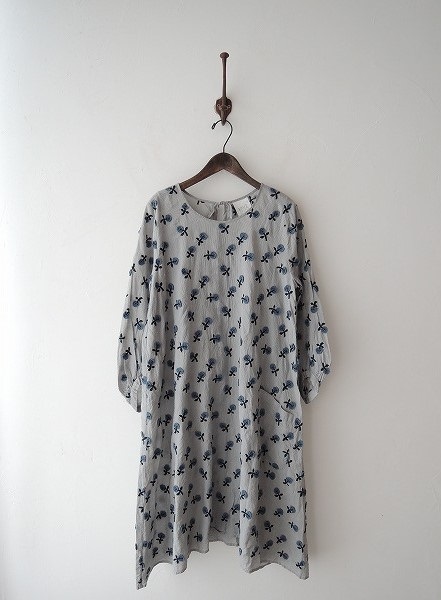 デザイン:ミナペルホネンランドリー 「skip」のシャツワンピースです。グレー系の細かいストライプ織のシルク混薄手生地ベースに、濃ネイビー×ブルーグレーのお花の刺繍があしらわれております。背上部に共布ひも付きのスリットが施されており、左腰にパッチポケットが付いております。裏地は付いておりません。(掲載写真は、実商品のカラーにできるだけ近づけるよう努力はしておりますが、お使いのモニターや画面設定等によっては、色が異なって見える場合もございますので、予めご了承下さい)