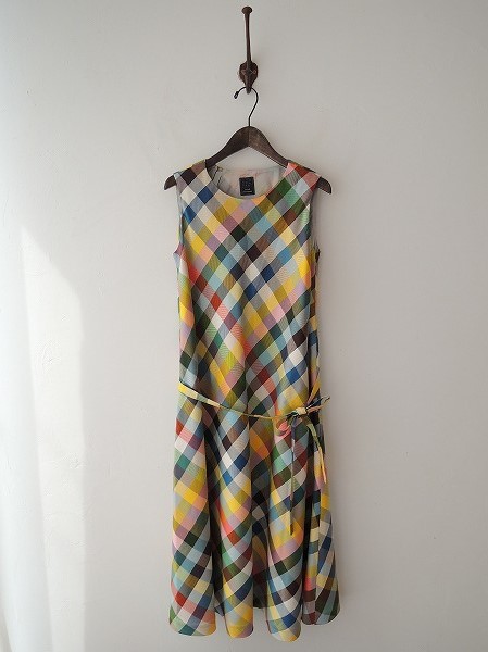 デザイン::mina perhonen 「multicheck」のノースリーブワンピースです。カラーはやや光沢のあるミックスカラーのチェックで、背右上のループボタン付きドロップホールで着脱可能です。付属の共布ひもが付いており、裏地付きです。(掲載写真は、実商品のカラーにできるだけ近づけるよう努力はしておりますが、お使いのモニターや画面設定等によっては、色が異なって見える場合もございますので、予めご了承下さい)