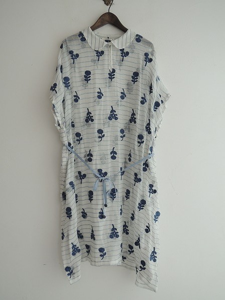 デザイン:mina perhonen 「bonheur」のワンピースです。カラーはオフホワイト×くすんだブルーのボーダー織りの透け感のあるガーゼ地ベースに、ネイビーブルーで花の刺繍が施されております。フロントにはループボタンが1つあり、ライトブルーの腰ひも付きで、裏地はございません。定価は58,800円です。(掲載写真は、実商品のカラーにできるだけ近づけるよう努力はしておりますが、お使いのモニターや画面設定等によっては、色が異なって見える場合もございますので、予めご了承下さい)