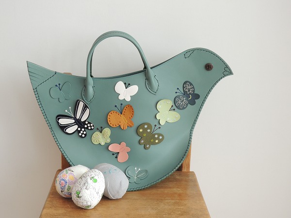 デザイン:mina perhonen 「tori bag」のとりバッグです。カラーはくすみがかったブルーグリーンでレザー地であしらわれており、フロントにはピンク・濃カーキ・パステルグリーンなどのカラフルなちょうちょのレザーモチーフがあしらわれています。別途、様々なテキスタイルの卵が3つ付属されております。