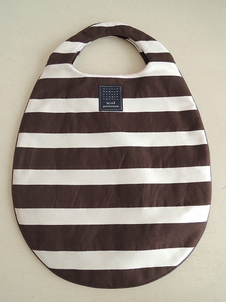 デザイン:mina perhonen 「journey」のエッグバッグです。カラーはオフホワイト×チャコールブラウンで、光沢のあるボーダー織の生地であしらわれており、サイド周りはチャコールブラウンの合皮のパイピングが施されております。内側はライトピンクの裏地で、素材は表地が綿49%・絹31%・ラミー20%、裏地がポリエステル100%、合皮部分の表皮がポリウレタン100%、裏がキュプラ80%・ナイロン20%です。