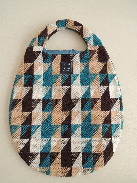 デザイン:mina 「triangle」のエッグバッグです。カラーはオフホワイト・ターコイズ・チャコールブラウン・ベージュで、幾何学風の柄編みニットであしらわれており、サイド周りはチャコールブラウンの合皮のパイピングが施されております。内側はくすんだブルーの裏地で、素材は表地が毛100%、裏地がポリエステル100%です。