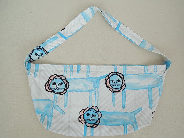 デザイン:mina perhonen 「look」のボディバッグ小です。ホワイトベースにライトグレー・ライトブルー・ブラック・ピンクで、総柄プリントが施されております。開口部は小鳥モチーフ付きのジッパー仕様で、内側はグレーの別地に切替られ、ポケットが1つ付いております。素材は表地が綿65%・麻35%、裏地が綿100%です。