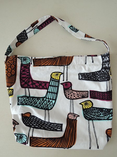 デザイン:mina perhonen 「mingling」のボディバッグ大です。カラーはホワイトベースで、グレー・イエロー・サーモンピンク・ブラウンなどでカラフルな鳥のプリントが全面に施されています。開口部はジッパー仕様で、ハンドバッグ用の持ち手が付いており、2wayでご使用頂けるデザインです。内側はベージュの別地に切替られ、ポケットが1つ付いております。素材は表地&裏地共に綿100%です。
