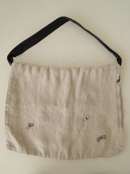 デザイン:mina perhonen 「choucho」のクラムバッグです。カラーはグレーベージュで、ブラックのチョウチョの刺繍が施されております。持ち手はブラックのレザーに切替えられており、二枚貝のように合わせられたデザインになっております。合わせられた内側にポケットが1つ付いており、開口部はサイドのジッパー仕様で、素材は表地がリネン100%、刺繍がキュプラ100%、牛革使用製品です。