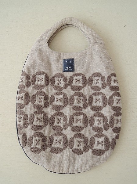 デザイン:mina perhonen 「dear」のエッグバッグです。カラーはグレーベージュで、チャコールグレーの刺繍入りのパイル地であしらわれており、サイド周りは濃ネイビーの合皮のパイピングが施されております。内側は光沢のある濃ネイビーの別地に切替られ、素材は表生地が麻80%、綿20%、刺繍部分が綿100%、裏生地がポリエステル100%です。