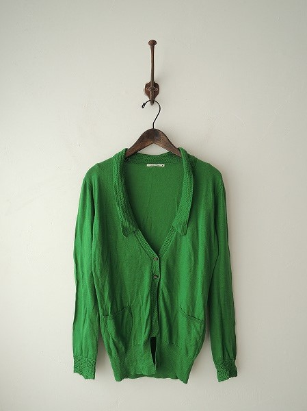 デザイン:mina perhonen「paula」のニットカーディガンです。カラーはグリーンで、ニット素材であしらわれております。フロント2つボタンで、衿・前立て・袖口に模様編み&透かし編みが施され、両腰ポケット付きです。(掲載写真は、実商品のカラーにできるだけ近づけるよう努力はしておりますが、お使いのモニターや画面設定等によっては、色が異なって見える場合もございますので、予めご了承下さい)