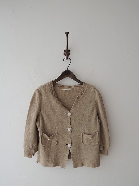 デザイン:mina perhonen 「nostalgia」の七分袖ニットカーディガンです。カラーはベージュで、薄手ニット地であしらわれております。フロントボタン開閉で、両裾にパッチポケット付きです。(掲載写真は、実商品のカラーにできるだけ近づけるよう努力はしておりますが、お使いのモニターや画面設定等によっては、色が異なって見える場合もございますので、予めご了承下さい)