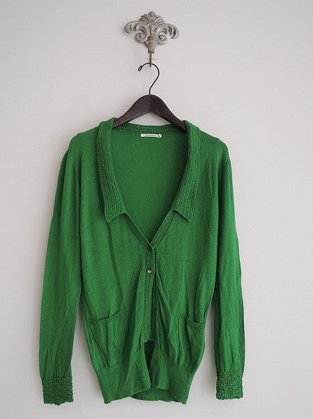 デザイン:mina perhonen 「paula」のニットカーディガンです。カラーはグリーンで、薄手ニット地であしらわれております。前立てや袖口などは鈎針編みに切替られ、両裾にポケットが付いております。(掲載写真は、実商品のカラーにできるだけ近づけるよう努力はしておりますが、お使いのモニターや画面設定等によっては、色が異なって見える場合もございますので、予めご了承下さい)