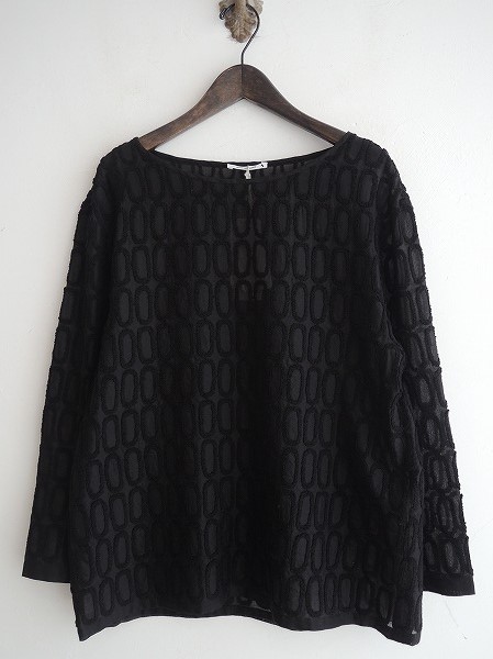 デザイン:mina perhonen 「grass window」の刺繍ブラウスです。カラーはブラックで、シルク混の透け感のある薄手生地ベースに、全面に刺繍が施されております。(掲載写真は、実商品のカラーにできるだけ近づけるよう努力はしておりますが、お使いのモニターや画面設定等によっては、色が異なって見える場合もございますので、予めご了承下さい)