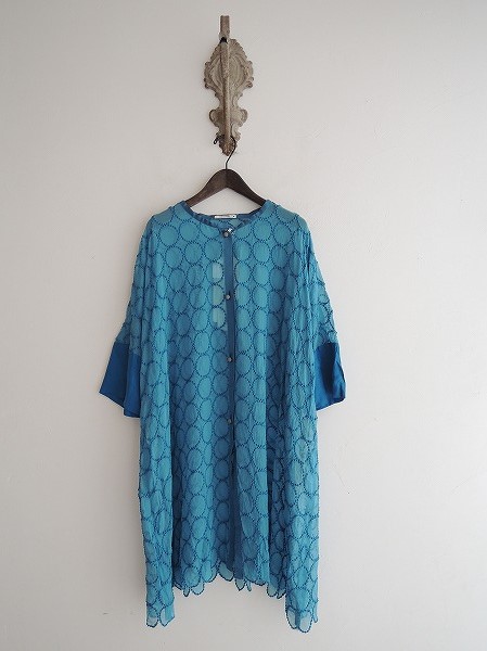 デザイン:mina perhonen 「tambourine」のチュニックワンピースです。カラーはライトブルー系で楊柳シルクシフォン地であしらわれており、全面に刺繍が施されております。袖丈は七分くらい、ややワイドなシルエットで裏地は付いておりません。定価84000円の商品です。(掲載写真は、実商品のカラーにできるだけ近づけるよう努力はしておりますが、お使いのモニターや画面設定等によっては、色が異なって見える場合もございますので、予めご了承下さい)