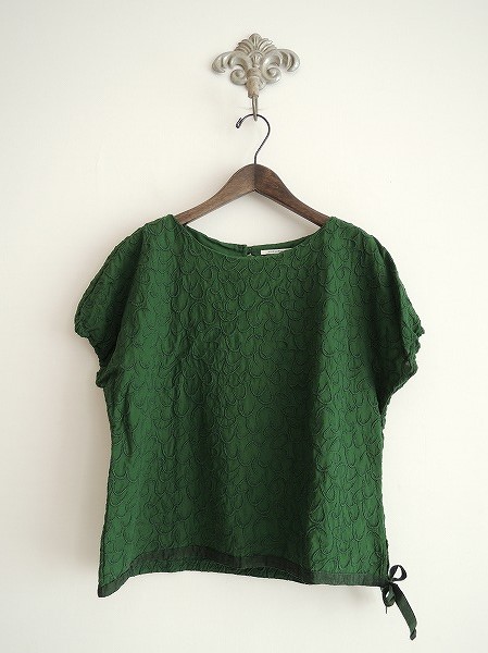 デザイン:mina perhonen「rustle」の刺繍ブラウスです。カラーはグリーンで、全体に刺繍が施されています。バックネックにループボタンが付いており、左裾サイドの紐を結んでいただけます。 袖口はゴム入りです。 (掲載写真は、実商品のカラーにできるだけ近づけるよう努力はしておりますが、お使いのモニターや画面設定等によっては、色が異なって見える場合もございますので、予めご了承下さい)