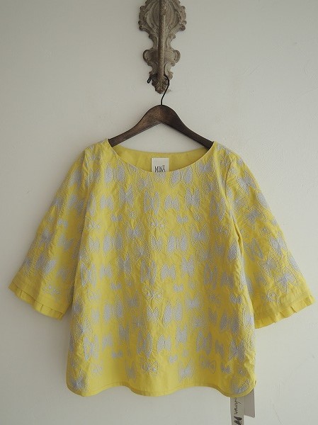 デザイン:ミナペルホネンランドリー 「sky flower」の刺繍ブラウスです。カラーはイエローベースにライトグレーで蝶の刺繍が全面に施されたデザインで、袖口にはフリルがあしらわれています。定価は33,600円です。(掲載写真は、実商品のカラーにできるだけ近づけるよう努力はしておりますが、お使いのモニターや画面設定等によっては、色が異なって見える場合もございますので、予めご了承下さい)