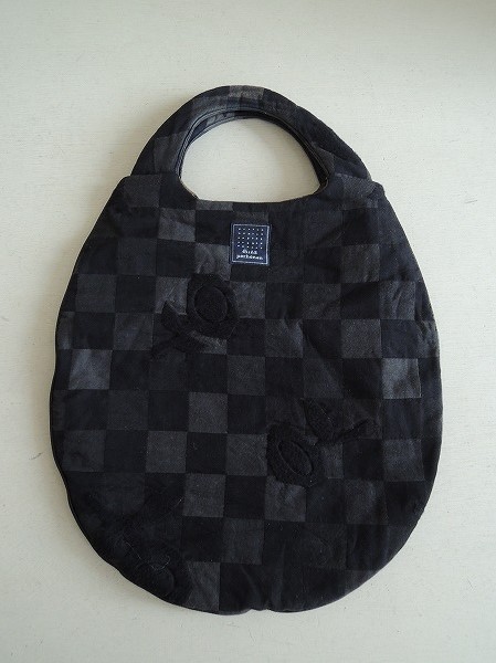 デザイン:mina perhonenのdim nightシリーズのエッグバッグです。カラーはブラック×グレーのブロックチェック生地に、ブラックでお花の刺繍が施されたデザインで、パイピングはブラックの合皮です。内側には光沢のあるブラウンの裏地が付いており、素材は表生地が綿100%、裏生地がポリエステル100%です。