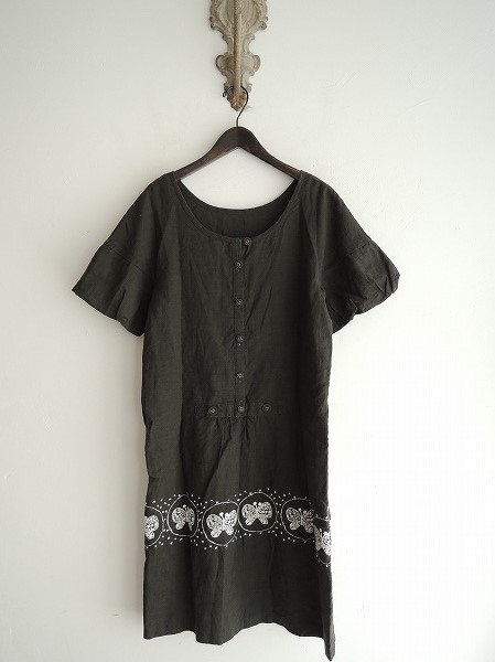 デザイン:ミナペルホネン 「forest wing」の刺繍ワンピースです。カラーはダークグレー系で、ホワイトの刺繍入りのやや薄手生地です。フロント半開ボタンで、右ヒップにはポケットが付いており、ウエストバックのみ共布ベルトが施されています。(掲載写真は、実商品のカラーにできるだけ近づけるよう努力はしておりますが、お使いのモニターや画面設定等によっては、色が異なって見える場合もございますので、予めご了承下さい)