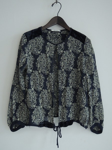 デザイン:mina perhonen「sometimes lucky」の刺繍ブラウスです。カラーはネイビーで、ベースの透け素材にカットワーク刺繍があしらわれ、ヨーク部分と前裾はパイル生地に切り替えられています。前裾にはゴム入りで、フロントネックのボタンと裾のひもを結び留めるデザインです。(掲載写真は、実商品のカラーにできるだけ近づけるよう努力はしておりますが、お使いのモニターや画面設定等によっては、色が異なって見える場合もございますので、予めご了承下さい)