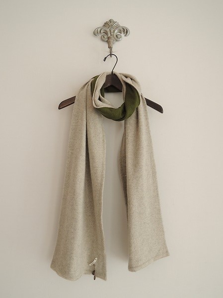 デザイン:mina perhonenのdozeシリーズのニットマフラーです。カラーはミックスライトグレーベージュ×ダークグリーンの2枚合わせデザインで、柔らかな肌触りのニット素材であしらわれております。ブランドタグ下にグレー系のきのこの刺繍モチーフが付いております。