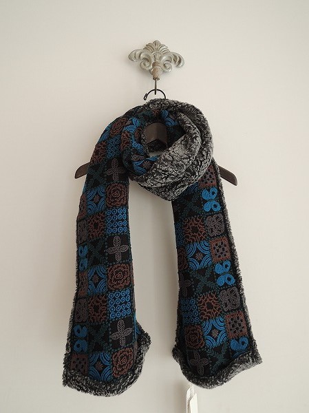 デザイン:mina perhonenのforest tileシリーズの刺繍マフラーです。カラーはミックスグレーのボアと、ブラックのメッシュ地に鮮やかなブルー×グレー×ダークグリーン×こげ茶などの刺繍があしらわれた生地の組み合わせです。素材は表生地がコットン100%、刺繍部分はコットン100%、裏生地はアクリル50%、ウール30%、ベビーアルパカ20%で、定価は35,700円です。