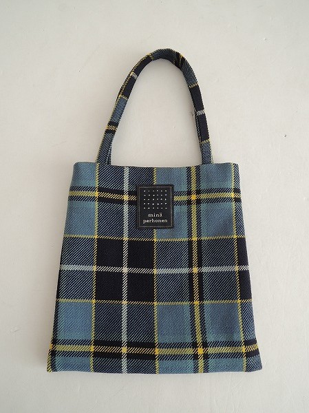 デザイン:mina perhonenのtartanシリーズのミニバッグです。カラーはくすんだ水色、濃紺、イエロー、ホワイトのチェック柄織りで、内側には濃紺の裏地が付いています。素材は表地が毛100%、裏地がポリエステル100%です。