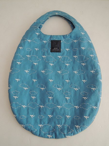 デザイン:mina perhonenのhiko-kiシリーズのエッグバッグです。カラーは鮮やかな濃いめの水色地にホワイトで刺繍が全面に施されたデザインで、内側には同カラーの裏地が付いています。素材は表生地が麻58%、綿42%、刺繍部分が綿100%、裏生地がポリエステル100%です。