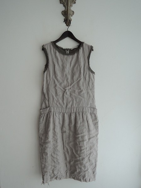 デザイン:mina perhonen 「kailas」のワンピースです。カラーはほんのり紫がかったグレーで、ネック周り&袖口&裏地にはカットオフされた緑がかったグレーの別布が施されています。バックジッパー&ホックで着脱でき、両腰にはポケットがあります。(掲載写真は、実商品のカラーにできるだけ近づけるよう努力はしておりますが、お使いのモニターや画面設定等によっては、色が異なって見える場合もございますので、予めご了承下さい)
